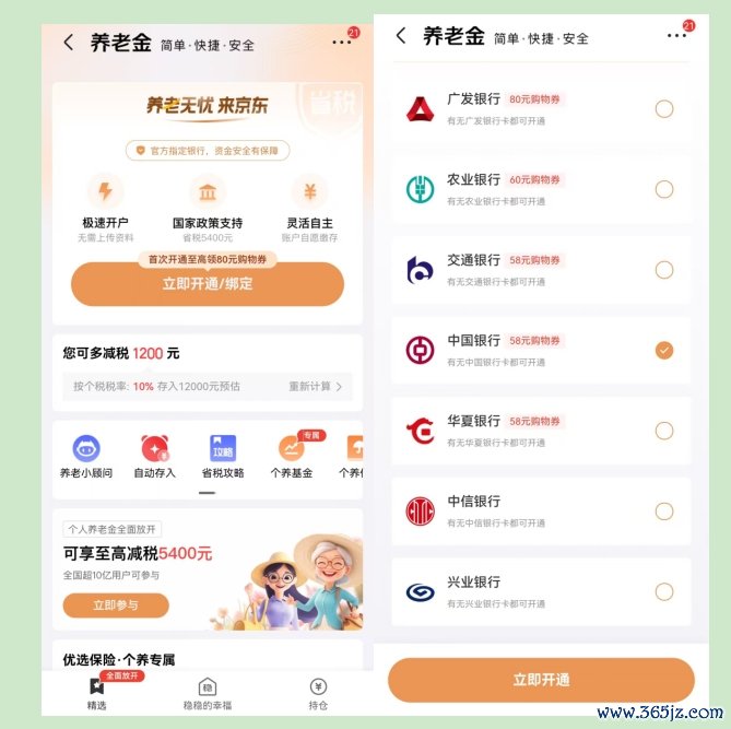 相关页面显示,京东金融与广发银行、农业银行、交通银行、中国银行、兴业银行等多家银行均有合作,选择在合作银行开通个人养老金账户,用户可获得50-80元不等的京东商城购物券。