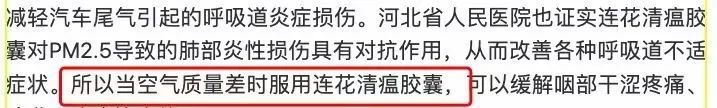 这项研究是河北人民医院做的,研究结论是,连花清瘟胶囊对PM2.5导致的肺部炎性损伤有对抗作用。然后各地媒体铺天盖地地宣发,空气质量差时,服用连花清瘟胶囊。