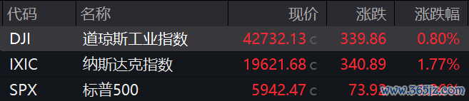 当地时间上周五,美国三大股指全线收涨,道指涨0.8%,标普500指数涨1.26%,纳指涨1.77%。